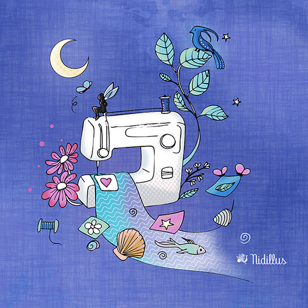 Sur ce motif, une machine à coudre s’entoure de fleurs et plantes, d’une rivière qui s’écoule doucement, d’une petite fée bienveillante. Tout ce qui évoque cette liberté et ce bien-être que la couture nous offre : s’évader, respirer, oublier le quotidien parfois monotone pour entrer dans notre bulle créative.