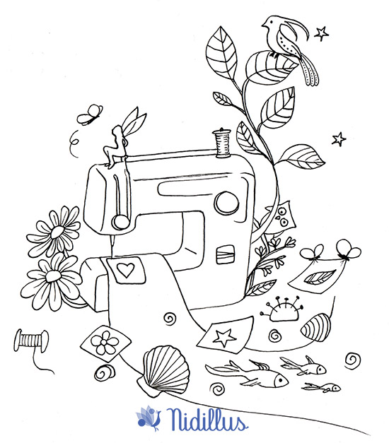 Cette illustration, je l’ai dessinée en pensant à ces moments précieux où nous nous installons devant notre machine, où le temps s’arrête un instant. Où seuls existent le fil, le tissu, et cette sensation de créer quelque chose de nos mains.