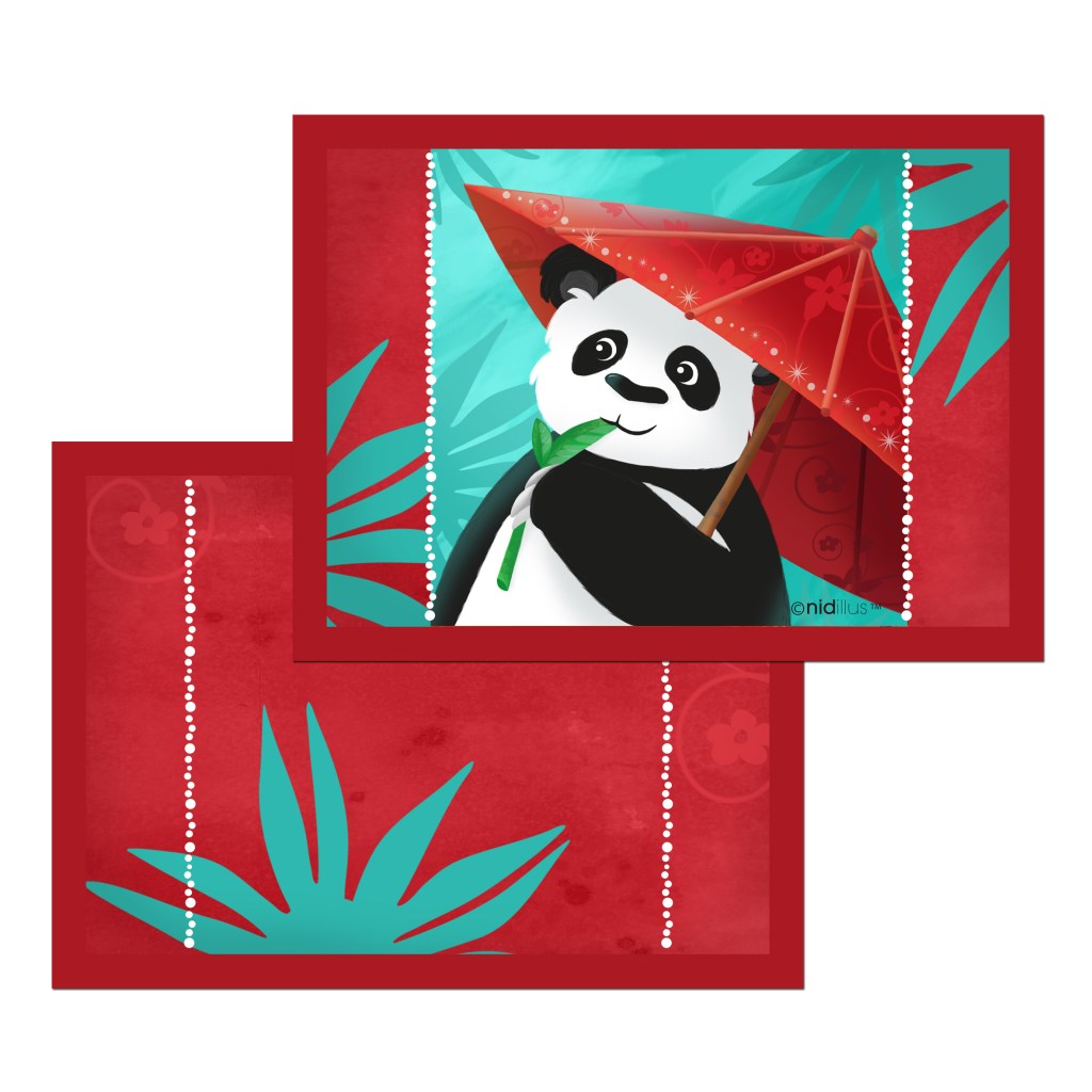 3- LES GAINS : – 1 coupon Nidillus en simili cuir format pochette 2 faces « Panda et ombrelle » en 14x20cm.
